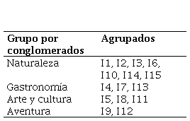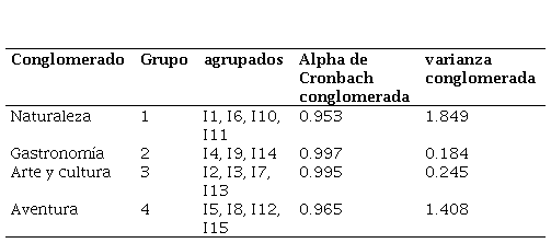 Una vez definidos los indicadores se procedió a calcular su fiabilidad; demostrando que para el presente estudio todos los indicadores considerados son relevantes; por lo que se da paso a la agrupación de clústeres, y mediante un análisis comparativo de conglomerados se muestra que, de los grupos propuestos, es el de naturaleza el que mayor número de ítems agrupados posee. Esto se debe a que las otras tipologías de turismo pueden desarrollarse dentro de espacios naturales.
