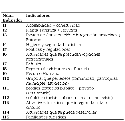 Se inicia con el análisis de los criterios expresados en el Manual de atractivos turísticos, metodologías dadas por el MINTUR, ya que, recurriendo a conceptos básicos, una ruta o circuito turístico está compuesto por atractivos o recursos que generan el interés de los visitantes. El manual presenta un análisis exhaustivo de un atractivo, pero para el caso de una ruta o circuito turístico, al ser un campo de acción más amplio que abarca más de un atractivo, no se podrían aplicar todos los criterios descritos en la herramienta. Por ello, se procedió con la deconstrucción de dicho manual y se seleccionaron los indicadores enlistados en la Tabla 1, los cuales se han escogido debido a que son indispensables y primordiales para el funcionamiento de una ruta o circuito turístico rural. Otros criterios no se han seleccionado debido a que no son fáciles de aplicar de forma general en otras rutas. Se obtuvo como resultado un total de 15 indicadores con base en el estado del arte y la experticia de los técnicos del Gobierno Provincial del Azuay (Tabla 1).