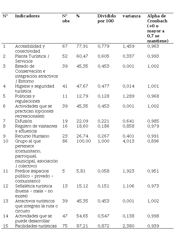 Una vez analizados los datos obtenidos, denota que no se requirió discriminar ninguna de las variables analizadas, pues según el criterio de los participantes que registraron sus respectivas rutas y circuitos rurales, todas las variables enlistadas son importantes y se pueden aplicar en sus territorios. Previo el análisis, se realizó la segmentación con base en cuatro tipologías de turismo (naturaleza, arte y cultura, gastronomía, aventura), se agruparon los correspondientes ítems, se analizó nuevamente el Alpha de Cronbach con el objetivo de conocer la dispersión de las variables, y se consideraron más importantes a las variables de menos dispersión, es decir las que se acercan más a 0,7, siendo estas las tipologías de naturaleza y aventura, agrupándolas conforme se presenta en la Tabla 3.