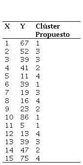 Los datos constan de 15 elementos de datos que pueden verse como puntos bidimensionales. Como hay cuatro grupos, se comenzó asignando el primer elemento al grupo 1, el segundo al grupo 2, el tercero al grupo 3, etc., hasta llegar a la convergencia de los clústeres calculados.