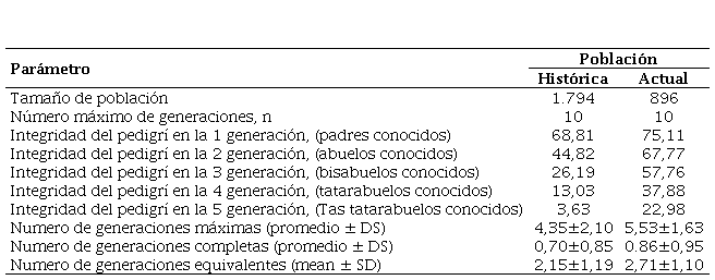 En la Tabla 2 se muestra la integridad de pedigrí de las poblaciones en estudio. La integridad del pedigrí de la primera generación en la población histórica fue de 68,81% que se incrementó a 75,11% en la población actual. En la segunda y tercera generación fue de 44,82-26,19 y la actual de 67,77%-57,76%, para las dos poblaciones respectivamente (Figura 1). En las generaciones siguientes se produjo un decrecimiento progresivo llegando a 3,63 y 22,98% en la quinta generación para las dos poblaciones.