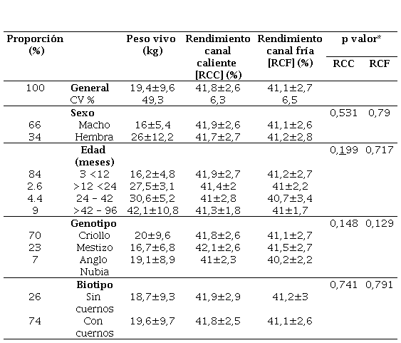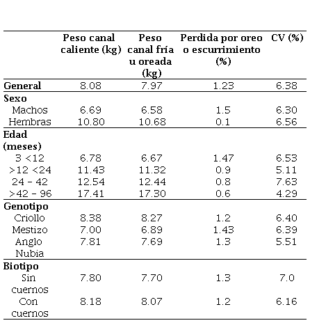 Al analizar el factor genético se pudo evidenciar que los mejores rendimientos son de los genotipos mestizos (42,1% RCC y 41,5% RCF), luego los criollos (41,8% RCC y 41,1% RCF) y Anglo Nubia (41% RCC y 40.2% RCF). Pero, en lo que se refiere a la pérdida de peso por escurrimiento de la canal, los mejores comportamientos fueron de los criollos (1,2%), luego los Anglo Nubian (1,3%) y finalmente los Mestizos con el 1,43% (Tabla 2).