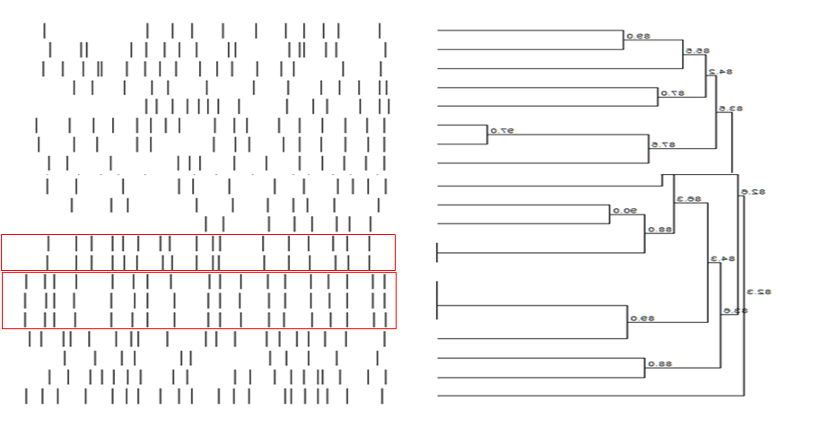 * Los paneles en rojo muestran la agrupación de 11cepas representativas de humanos en 4 clústeres y 5 cepas representativas de cerdos en dos clústeres. El porcentaje de similitud entre las cepas se representó en un dendograma de homología utilizando el algoritmo UPGMA.