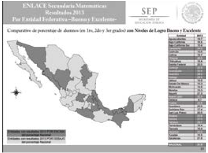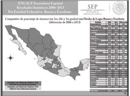 Dichos datos posicionan a Tamaulipas por encima de la media nacional, pero en los resultados de la prueba ENLACE 2013, los niveles de aprovechamiento entre “Bueno” y “Excelente” ubican a la entidad por debajo de la media nacional, con un resultado de 16.4%. Este dato la ubica en el grupo de estados con resultados por debajo de la media nacional, inclusive con aquéllos considerados de alta y mediana marginación, como Chiapas, Oaxaca, Zacatecas, Michoacán y Tlaxcala. De lo anterior se deduce que, a pesar de que se avanza en cobertura e infraestructura, en cuanto a la calidad de la educación no se transita del todo bien, al menos en Español y Matemáticas en el nivel de secundaria.