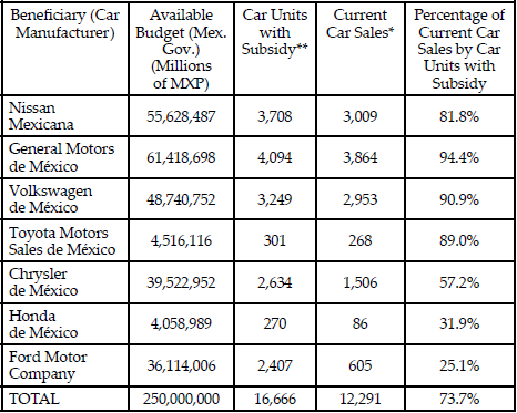 The program ended in March 2010, but not all the economic resources were used, and the final rate of effectiveness reached 77% of all the budget set. Also, the program was extended four more months after March, but there was still no demand (Lacatto Ojeda, N/A). This is additional information to conclude that the program didn’t reach the expected results. Table 3 shows the total amount of resources available for every major car manufacturer in Mexico under that program, the total car sales made and the number of cars recttcled during the period (Ministrtt of Economtt, 2010).