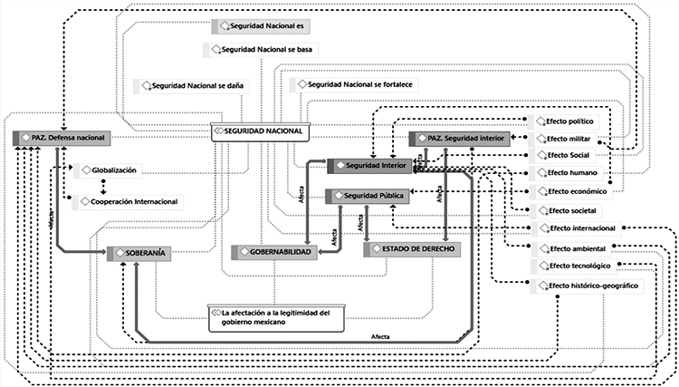 El fenómeno de la afectación de la legitimidad del Gobierno –y consecuentemente de la seguridad nacional–, se explica a partir de dos fases, como se muestra en la red teórico-explicativa que conceptualiza este complejo fenómeno, mostrando las conexiones entre los elementos en un diagrama visual, que a continuación se explica.