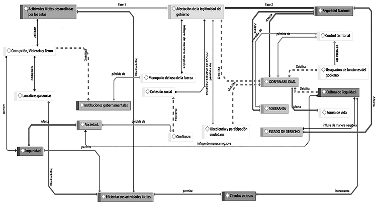 El fenómeno social de la afectación de la legitimidad del Gobierno es por sí mismo complejo y difícil de explicar. Desde un enfoque que parte por causa de las actividades ilícitas que desarrollan las organizaciones criminales y, en particular los zetas, se ofrece el siguiente postulado como aproximación explicativa: