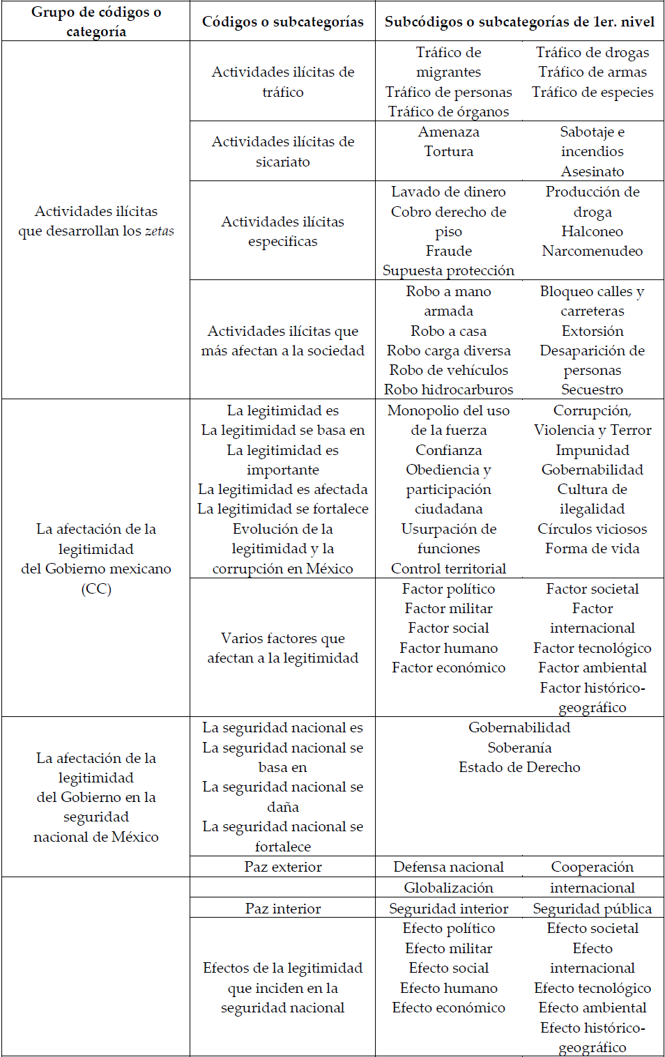 Se realizó un análisis comparativo con otros grupos armados y de manera inductiva la opinión de 33 expertos, mediante la codificación ecléctica, empleando el programa ATLAS.ti. Se ofrece una categorización de las actividades ilícitas que desarrollan los zetas; los elementos que afectan la legitimidad del Gobierno y que en consecuencia alteran la condición de seguridad nacional; la determinación de diez factores que inciden en la legitimidad del Gobierno con efectos en la seguridad nacional; y una aproximación sobre la evolución de la corrupción en México y el proceso de legitimación del Gobierno mexicano.