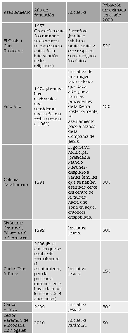 Entonces, los asentamientos tarahumaras en la ciudad de Chihuahua son espacios definidos bajo un criterio étnico. En este sentido, son la expresión urbanística del encuentro y la convivencia, así como de la marginación y la segregación que operan en el proceso de las relaciones entre los rarámuri y los no-indígenas. Todos fueron establecidos en los márgenes de la ciudad, o en colonias tradicionalmente habitadas por pobladores de bajos recursos económicos.