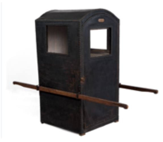 Aunado a esto, el señor ostentaba nada más y nada menos que "una silla de manos vieja," un transporte de lujo que debía ser cargado por esclavos o sirvientes para que los dueños no caminaran y que se tapizaban con elegantes telas (ver imagen 12). La silla de don Sebastián con todo, no era de las más caras, pues no contaba con vidrieras, (doña Catalina sí tenía "dos docenas de vidrios grandes y pequeños") sino que tenía en vez de estas "dos encerados de ruán de China" que se usaban a manera de ventanas y permitían traspasar las luz. Cuando no se usaba la silla de manos, los más ricos usaban coche o caballo, pero en sus bienes no se registra ninguno de estos últimos, aunque sí "una silla xineta [sic] con estribera de medio lazo y coraza de Michoacán, freno y espuelas sin huellas" además de "un almofrej, y manta de jergas viejo" ( AHMP, 1686, caja 6, exp. 56) para utilizarse en viajes.