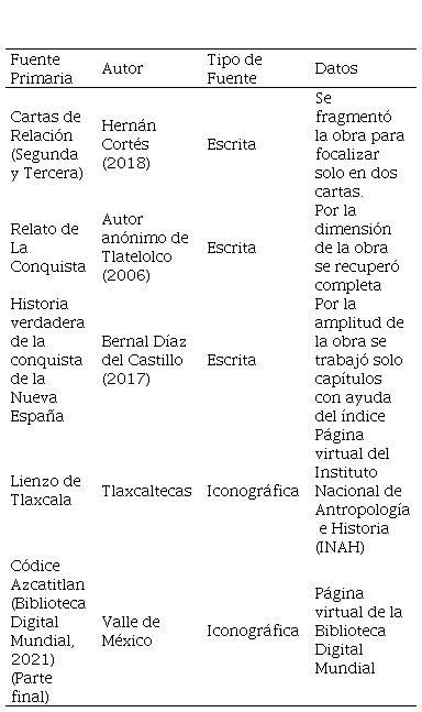 Este proceso de selección de fuentes se realizó con la idea de tener un abanico amplio para analizar el tema de La Conquista de México. Hurtado (2015)señala las principales diferencias entre fuentes primarias y secundarias, donde además distingue con claridad la manera de identificar y clasificar cada una de ellas. Además del apoyo que resultó el texto de Hurtado, se consultaron plataformas digitales con fuentes primarias como la del Instituto Nacional de Estudios Históricos de las Revoluciones de México (INEHRM) y la Secretaría de Cultura de la Ciudad de México.