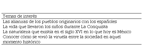 A los docentes involucrados en la investigación se les propuso partir de algunas preguntas provocadoras [2] de temas que pocas veces son recuperados por los libros de texto y que Pagés (1994; 2011; 2018) nos propone para indagar en la historia. Las preguntas recuperan grupos como niños, mujeres, indígenas y algunos conceptos como la alimentación y la naturaleza. La idea de mostrar una variedad de temas es que el docente deje a un lado las fechas, los personajes principales, las batallas y así insistir en el desarrollo de pensamiento histórico.