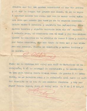 El proceso epistemológico que parte de la memoria declarada de la familia, de los archivos y los documentos se hace visible en una carta que podemos considerar como una prueba documental, en donde José Salvador Chávez Corona reconoce que su hijo Rafael de 6 años, ha sido testigo de la guerra y como padre se propone ayudarlo a que supere el miedo. La manera que lo hace es desde el lugar que él conoce y cree conveniente intervenir. La carta tiene fecha del 18 de agosto de 1916 (ver figura 8), fue escrita desde Cuernavaca, Morelos, en máquina de escribir, su instrumento de trabajo para rendir informes. Los párrafos son cortos y están separados por su firma, como para mostrar que no fue escrita en un solo momento, sino en varios y distintos lapsos (ver figura 9). Por el contenido, sabemos que sus cartas eran enviadas con alguna persona que viajara a la Ciudad de México pues, según el texto, enviaba dinero y recibos cuya llegada confirmaba en la carta siguiente. El texto que retomo da información de primera mano, en el sentido de que él participaba con el ejército y toda la fuerza militar en Morelos, por eso me pareció importante describir el momento que se vivía para comprender el contexto en el que el bisabuelo escribía sus cartas durante los meses de agosto, septiembre y octubre de 1916.