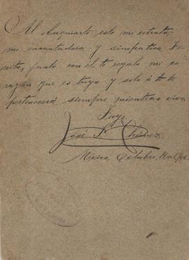 Después conoció a Josefina Luna, originaria de la Ciudad de México. Ella era tres años mayor que él, según consta en el acta de matrimonio. La figura 2 ilustra el reverso de la foto del bisabuelo, está fechada en 1906 y se la dedica a Josefina: “Al obsequiarte este mi retrato, mi encantadora y simpática Finita, junto con él, te regalo mi corazón que es tuyo y sólo a ti te pertenecerá siempre mientras viva”.