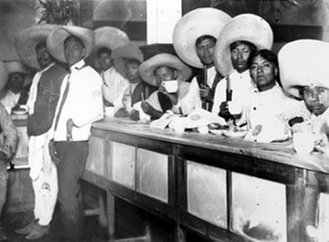 Los discursos políticos se fueron consolidando años atrás, a través de intelectuales destacados como los hermanos Flores Magón, quienes desde Estados Unidos, como asilados políticos, divulgaban sus ideas anarquistas a través del periódicoRegeneración. Desde septiembre de 1911 el Partido Liberal había lanzado un manifiesto en el cual llamaba a “abolir la propiedad privada” y levantaba la consigna que Marx dio a la Primera Internacional: “la emancipación de los trabajadores debe ser obra de los trabajadores mismos”. De ahí que la entrada del ejército revolucionario a la Ciudad de México –en 1914- esté documentada en la historia del país como un evento fundacional de la Revolución Mexicana, a pesar de que ocurrió después de varios años de guerra civil. Los hermanos Casasola hicieron un registro fotográfico de la entrada de ambos ejércitos revolucionarios a la Ciudad de México. La figura 6 muestra la visita de los revolucionarios a un restaurant elegante ubicado en el Palacio de los Azulejos[3]. Actualmente existen varias fotografías que documentan este acontecimiento en el mismo lugar y forman parte de la memoria colectiva de la capital.