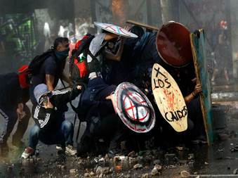 El hito histórico, que para este estudio tiene el estatus de acontecimiento, y que marcó un antes y un después del Chile reciente es, no hay lugar a dudas, el denominado “estallido social” comenzado el 18 de octubre de 2019. La quema de 32 estaciones del Metro de Santiago de Chile fue quizás su manifestación más elocuente. Con todo, fueron alrededor de cuatro semanas con intensas manifestaciones sociales, muchas de ellas con un grado de violencia pocas veces visto, así como manifestaciones pacíficas en las capitales regionales del país, siendo la más importante la del 25 de octubre donde millones de personas se manifestaron pacíficamente en Santiago, Valparaíso, Concepción y otras ciudades. La concentración de personas en Santiago ese día quedará en los anales de las marchas del país con más de un millón de personas en las calles de la capital. Un oasis de paz dentro de semanas de quemas de supermercados, automotoras, bancos y una serie de vandalizaciones generalizadas al comercio en general en muchas regiones del país. Se hizo popular la “primera línea” (Figura 1), grupo de ciudadanos organizados que estuvieron dispuestos a ser el primer bloque de combate callejero frente a las fuerzas de Carabineros.
