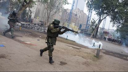 La fuerza policial cayó en excesos comprobados (Figura 2), dejando miles de heridos y un número no menor de mutilaciones oculares por el mal uso de fuerza pública. Hasta el 28 de octubre el Instituto Nacional de Derechos Humanos reportaba más de mil cien heridos, 127 personas con heridas oculares y más de tres mil quinientos detenidos (Bravo y Pérez, 2022, p. 603). Los casos de Fabiola Campillai y Gustavo Gatica fueron los más comentados en la prensa nacional. Ambos fueron víctimas con rostros mutilados con pérdida total de la visión. El caso de Gatica representa los efectos de la violencia ante un ciudadano que se manifestaba en las calles. El de Campillai resulta aún más sobrecogedor. Ella estaba junto a su hermana esperando locomoción para trasladarse en la comuna de San Bernardo, la tarde del 26 de noviembre, cuando un casquete de bomba lacrimógena impactó en su rostro. El paradero donde se encontraba esperando estaba cerca de una manifestación que por esa hora ya estaba apaciguándose. El destino se cruzó de forma cruel con esta mujer de tres hijos. La memoria de las violaciones a los Derechos Humanos cometidos por fuerzas del Estado en los diez y siente años de dictadura volvía ahora bajo otro contexto. Otra relación con el pasado que no pudo estar ajena por esos días.