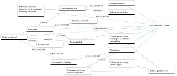 Por otro lado, la identidad cultural se consolida a través de la cultura gastronómica, que tiene influencia regional, es parte del patrimonio cultural, presenta interés por la historia y la cultura local, y es una propiedad de la diversidad cultural. También se encontró que, para los docentes, la identidad cultural se construye desde un proceso de adaptación, que es una propiedad de la investigación científica, que a su vez se asocia con la cosmovisión y con la historia regional.
