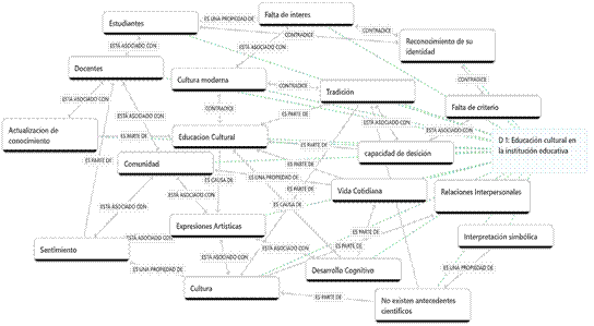 Así mismo, las tradiciones, costumbres y relaciones interpersonales son parte de la cultura que está asociada con las expresiones artísticas, que a su vez son causa de educación cultural y esta es parte de la tradición y de la vida cotidiana, pero se contradice por una cultura moderna que está asociada con la falta de interés y de criterio de los estudiantes al reconocimiento de su identidad.
