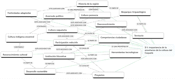 Los datos también reflejan que la cultura caqueteña está asociada con las festividades adaptadas a la historia regional y al reconocimiento del territorio. Además, que los proyectos participativos e inclusivos de la educación cultural tienen una participación reducida, producto del desconocimiento y de la falta de equipos y herramientas tecnológicas que permitan su divulgación. Pero que también, a través de la consolidación del proyecto “Petroglifos El Encanto”, se asocia el reconocimiento cultural indígena ancestral. Por otra parte, se deduce que la cultura caqueteña se relaciona con el acomodo político y que además está asociada con una cultura dejada.