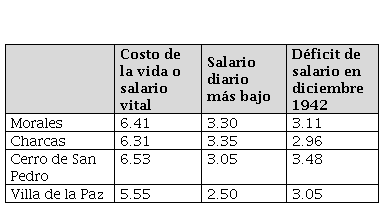 Por otra parte, los salarios pagados en la minería se caracterizaban por ser insuficientes para la manutención de las familias. Los censos que la SEP levantó en diferentes años permiten corroborar el bajo nivel de los sueldos (SEP, AD, Censos). También los documentos del emplazamiento a la huelga general minera de 1944 dejaron detallados estudios de las condiciones económicas en que vivía la inmensa mayoría de los trabajadores mineros y sus familias. El sindicato minero hizo el cálculo de costo de la vida para una “familia obrera tipo” compuesta por un trabajador, esposa, hijo lactante, hijo de diez años y un anciano. La Tabla 1 muestra los resultados de ese estudio para cuatro localidades potosinas.