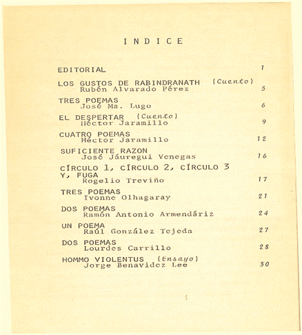 En su mayoría, las colaboraciones publicadas eran hechas por docentes de la Escuela de Filosofía y Letras. Por citar algunos ejemplos, Federico Ferro Gay[6] publicó, el 20 de abril de 1980, un reportaje cultural titulado Presencia de Chihuahua en Albuquerque, Nuevo México, donde narra la participación del alumnado de la carrera de Filosofía de la Escuela de Filosofía y Letras en un congreso y la buena recepción que tuvieron por parte de sus pares norteamericanos; Arturo Rico Bovio[7]participó, el 29 de junio de 1980, con su poema “Árido Andar” y Luis Nava Moreno,[8] el 5 de agosto de 1980, publicó el poema “Y nada que llueve, pero…” y “Porque no estoy a solas”, el 12 de octubre del mismo año. Por otra parte, Francisco Flores Aguirre[9] tenía una sección fija llamada “Yo puedo decir”, seguido del título del relato, obra de teatro, ensayo o artículo de divulgación con el cual participara; José Antonio García Pérez[10] colaboraba en ocasiones con relatos (el 11 de mayo de 1980 publicó “Sopa de letras” y el 6 de julio de ese mismo año “No hay nada nuevo bajo el sol”), poemas (el 21 de septiembre de 1980 publica “Un poema cada día” y “El verbo diario” el 3 de octubre del mismo año) o simplemente con ilustraciones; Enrique Pallares Ronquillo[11]colaboró por lo menos en dos ocasiones con ensayos. También colaboraban periodistas culturales, entre quienes se destacan Jorge Benavides Lee, debido a su constancia, y Víctor Bartoli, quien en 1985 ganaría el Premio Chihuahua con su novela Mujer alabastrina. El alumnado de la Escuela de Filosofía y Letras colaboraba en menor medida. Destaca el licenciado en filosofía Sergio Armendáriz Díaz, quien colaboró con ensayos de manera constante a lo largo de 1980, o “Llovizna”, el seudónimo de una autoría que publicó entre el 24 y el 31 de agosto.