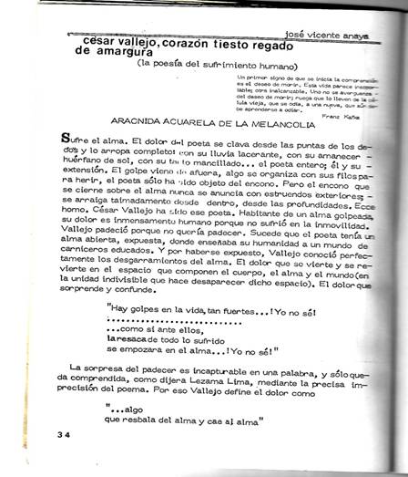 Palabras sin arrugas fue una revista autogestionada e independiente. Sabemos, debido a la editorial del número 8, que la irregularidad en las publicaciones se debía a: “[…] obstáculos del tipo económico, por una parte, y ausencia de coordinación por la otra, han retrasado la regular publicación de la revista” (Palabras sin arrugas, 1982, p. 1). El costo de la revista, por lo menos durante el año de 1982, era de 25 pesos, puesto que el precio venía incluido en la portada. El precio pudo variar en los últimos números, aunque no existe fuente que lo corrobore. A pesar del status independiente de Palabras sin arrugas, con el paso del tiempo, se convirtió en una revista con prestigio dentro del campo literario, debido a la participación de los agentes literarios cuya posición dentro del campo era favorable. Dentro de los primeros números que se encuentran disponibles, las colaboraciones eran más que nada entre amistades de los fundadores. Encontramos con frecuencia la presencia de Héctor Jaramillo, Rogelio Treviño, Rubén Mejía, Rubén Nevárez, Enrique Servín y Jorge Benavides Lee. Sin embargo, a partir del número 11 encontramos autorías dentro de la academia, tales como Arturo Rico Bovio y Federico Ferro Gay, quienes contribuyeron a la anexión de la Escuela de Filosofía y Letras a la UACH, además de ser docentes de la misma. Aparte, se incluyen jóvenes autorías que habían comenzado a publicar en editoriales universitarias, como es el caso de Sergio Loya[1], Alfredo Espinosa[2]y José Vicente Anaya[3]. En el caso de José Vicente Anaya, quien publicaría en el número 13 de la revista el ensayo “César Vallejo, corazón tiesto regado de amargura (la poesía del sufrimiento humano)” (ver Figura 2), su colaboración sería luego incluida en la antología César Vallejo. La perspectiva ausente en 1988, publicada por la UAM.