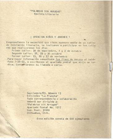 Dentro de las páginas de los últimos dos números de Palabras sin arrugas encontramos críticas a publicaciones del momento, en la sección “La lámpara de Diógenes (en busca de un libro)”. De los libros criticados, solo dos son de escritores chihuahuenses: el poemario Lámpara de la piedra y la traducción y estudio del Tratado de la lengua vulgar de Dante Alighieri por parte de Federico Ferro Gay (ambos libros bien recibidos por parte de Rubén Mejía y Jorge Benavides Lee, respectivamente). Las otras dos críticas pertenecen a los libros El asesinato del alma: la persecución del niño en la familia autoritaria del psiquiatra Morton Schatzman (una reseña favorable por parte de Rubén Nevárez), y la obra de teatro Orquídeas a la luz de la luna (1982) de Carlos Fuentes, donde Jesús Chávez Marín arremete contra la obra tachándola de artificiosa. Otro aspecto dentro de la noción de “redes”[5] de Annick Louis es la promoción de librerías. En el número 12, al final de la reseña de Tratado de la lengua vulgar hay una nota al pie de página que dice: “Los libros aquí reseñados los puede adquirir con El Fusquitas en su Librería ‘Humanitas’”.
