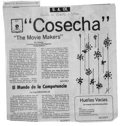 El suplemento “Cosecha” fue un espacio dentro de El Heraldo de Chihuahua destinado a la circulación de autorías ligadas de manera exclusiva a la Escuela de Filosofía y Letras de la UACH. Si bien hubo colaboraciones que no pertenecían a la academia, la pluralidad no fue una característica de “Cosecha”. En ocasiones, las autorías publicadas y que no estaban ligadas a la Escuela de Filosofía y Letras, se trataban de textos reconocidos por la crítica literaria. El 22 de febrero de 1981, por ejemplo, aparece un cuento de Gustave Flaubert, titulado “Una lección de historia natural” y el 22 de marzo del mismo año aparece un poema de Juan Ramón Jiménez, llamado “Primavera amarilla”, mientras que el 9 de mayo d 1982 aparece el poema “Anochece” de Carlos Montemayor, publicado apenas unos años atrás en su antología Abril y otros poemas en 1979. Tampoco podríamos descartar las colaboraciones de gente ajena a la Escuela de Filosofía y Letras, pero de igual manera que con los textos de autorías canónicas, fueron mínimas. Tan solo entre 1980 y 1982 se encuentran las siguientes colaboraciones ajenas a la Escuela de Filosofía y Letras y que no figuraban dentro del campo literario por sus posiciones dominantes. Tal es el caso del cuento “¿Compartir?” del ingeniero Nieves Adolfo Rivera quien, además de aparecer en “Cosecha” el 1 de noviembre de 1981 y el reportaje cultural de una conferencia de musicología llevada a cabo en el Centro Cultural Chihuahua, titulada “Inolvidable lección”, no se encuentran más datos respecto a ambas autorías.