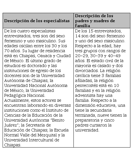 La primera especialista, dentro de sus múltiples contribuciones, obtuvo el premio Estatal de Ciencia, Tecnología e Innovación por la investigación con perspectiva de género otorgado por el estado de Oaxaca; la segunda cuenta con la Especialidad en Español y una Maestría en Tecnología Educativa; la siguiente ocupa un cargo en la Secretaría de Educación del Estado de Chiapas, en planeación educativa; y el ultimo especialista es docente frente a grupo en educación primaria. Los padres de familia, así como especialistas, aparecen codificados de la siguiente manera: MF=madre de familia, PF=padre de familia y E=especialista, esto con la finalidad de respetar la cláusula de confidencialidad.