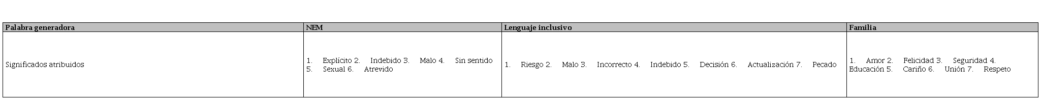 La Tabla 3 refleja los resultados de las redes semánticas utilizadas para capturar los significados que los padres y madres de familia vinculan con los conceptos. Primero, se les dio un concepto; de esa palabra, ellos mencionaron tres que les generó el concepto; una vez definidas, se procedió a ordenarlas de la más a la menos importante, colocando la más importante en el número 1, a la palabra medianamente importante en el número 2 y a la menos importante en tercer lugar. Así, se ordenaron las respuestas de acuerdo con el peso semántico que cada uno obtuvo, y de ello derivaron estas palabras. Esta técnica permite visualizar si son los verdaderos significados que les atribuyen, contrastándolas con las respuestas de la entrevista del eje de información y, de esa manera, observar si efectivamente es lo que piensan de los conceptos mencionados.