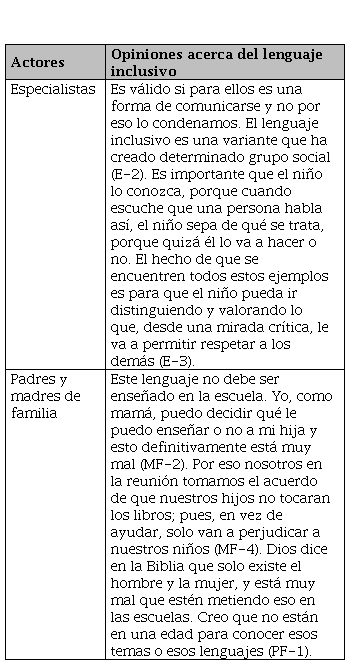 Los especialistas concuerdan en que la lengua se va modificando porque nuevas palabras se van integrando y es válido, ya que cuando decimos que todos somos iguales y que merecemos respeto, también se engloba a estos grupos que van surgiendo. Con el transcurso del tiempo vendrán nuevos términos y no sabemos si van a permanecer; puede ser que surjan nuevas formas de llamar a estos grupos o simplemente esto quede en el olvido. En caso contrario a lo que las especialistas mencionan, los padres y madres de familia tienen una opinión negativa respecto a este lenguaje, pues afirman que solo ha venido a descomponer la forma en la que se habla, y que afecta a la educación de los niños (Tabla 4).