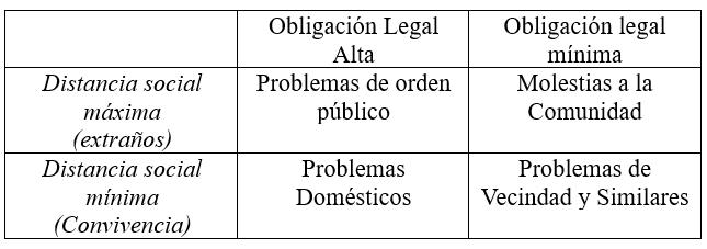 La tabla que elabora Redorta hace referencia al grado de relación que tienen las personas que conviven dentro de una comunidad y el impacto de las obligaciones legales que tienen sus conflictos comunitarios, por ende, de una forma más detallada en relación a la distancia social y el grado de exigencia de la ley, lo ha precisado Black (1980) en la siguiente lista, donde hace mención del tipo de grado de convivencia que tienen cada uno de los habitantes en una comunidad y el nivel del efecto legal, dado que estos son las bases para que la mediación policial se pueda desarrollar: