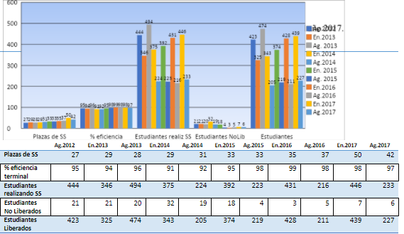 Con los datos de ese reporte, se elaboró la gráfica 7.1 y la tabla 7.1, que muestra la cantidad de estudiantes que realizaron Servicio Social por periodo y la eficiencia terminal de cada uno, por lo que es claro el avance en el incremento la cantidad de Servicio Social realizadas por año, y el aumento en la eficiencia terminal de las mismas.