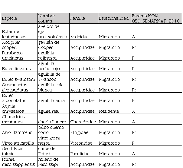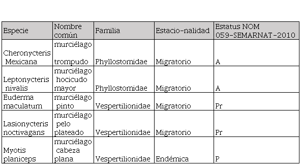 A continuación, se enlistan algunas de las especies con susceptibilidad a impacto por parte de grupo taxonómico de Aves ( Tabla. 1) consecutivamente se presentará un segundo listado con relación a los murciélagos ( Tabla. 2) y un tercero con relación a mariposas ( Tabla. 3).