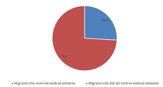 Eighty-seven percent of the interviewed has experienced medical necessities on the road. More than a half mentioned to have general discomfort, which includes common ailments such as flu, fever and pain. The second most recurrent health problem was ?road accidents?, with falling from trains as the most mentioned road accident (many Migrants ride on cargo trains). And the third one was related to pre and postnatal care, with two births on the road and a case of a transmigrant pregnant woman. Other health problems included gastrointestinal disorders, allergies, laboral accidents, asthma and injuries caused by violence.