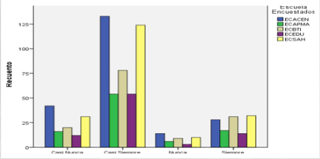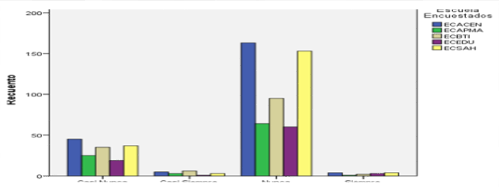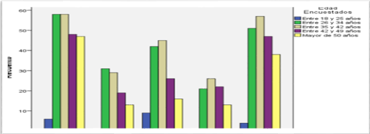 En el procesamiento de las variables escuela-edad se obtiene que en las escuelas el 29,5% de los encuestados se encuentran en el rango de los 35 a los 42 años, seguido por el 27,9% que se encuentra en el rango de los 26 a los 34 años y por el 22,3% que se encuentra en el rango de los 42 a los 49 años. Ver figura 3
