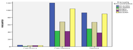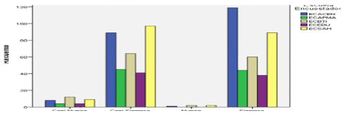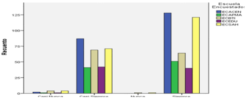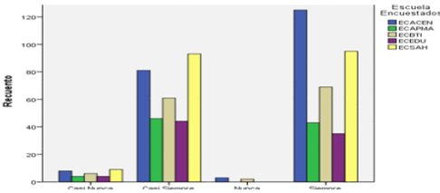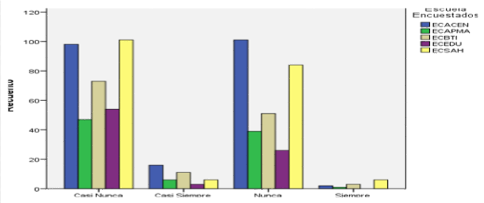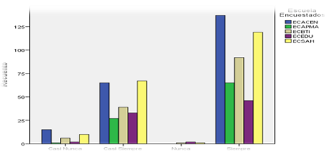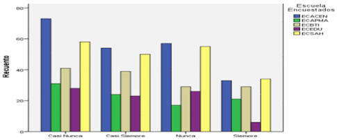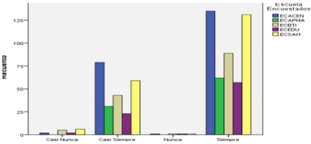 Se preguntó a los graduados: ¿Me incomoda cuando me piden realizar las cosas de otra manera?, encontrándose que la ECACEN tiene los mejores resultados donde el 13,9% de los graduados seleccionaron la mejor opción de respuesta que es nunca, seguido por la ECSAH con un 11,5 % y por la ECBTI con un 7,0 %. Ver figura 7.