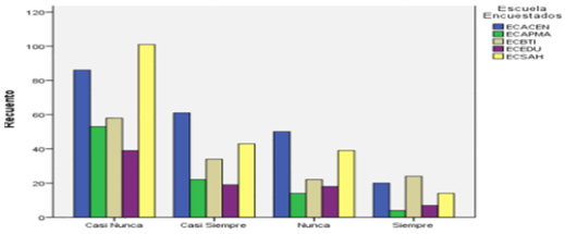 Se interrogó a los participantes: ¿Desde niño me ha gustado participar en actividades que me permitan obtener algún beneficio económico?, encontrándose que los graduados de ECACEN tiene los mejores resultados, el 12,6 % respondieron la mejor opción que es siempre, seguido por la ECSAH y ECBTI con un 9,1 % y 8,1% respectivamente. Ver figura 4.