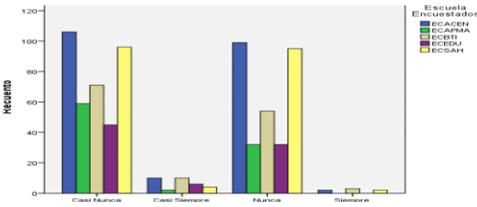 El interrogante formulado fue: ¿Cuándo emprendo una actividad y se presentan demasiadas dificultades tiendo a abandonarla? encontrándose que la ECACEN tiene los mejores resultados donde el 13,6% de los graduados seleccionaron la mejor opción de respuesta que es nunca, seguido por la ECSAH con un 13,0% y por la ECBTI con un 7,4%. Ver figura 13.