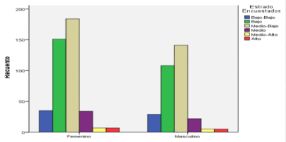 De las 519 personas encuestadas, el 57,4 % eran mujeres y el 42,6% eran hombres, de los cuales el 44,6% pertenece al estrato tres, el 35,6% al estrato dos y el 8,8 % al estrato uno. Ver figura 2.