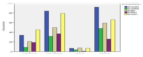 Cuando se consultó a los encuestados: ¿Me siento conforme con lo que tengo porque considero que los retos generan riesgos innecesarios?, encontrándose que la ECACEN tiene los mejores resultados donde el 17,3 % de los graduados optaron por la mejor opción de respuesta que es nunca, seguido por la ECSAH con un 15,5 % y por ECBTI con un 9,8%. Ver figura 5.