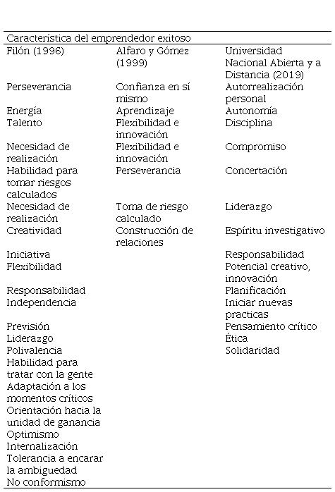 Son muchos los estudios que analizan las características del emprendedor notable, pero todas al final establecen similitudes que permiten comprender las razones que repercuten en el éxito o fracaso de las iniciativas que adelanten, a continuación, se presenta un resumen elaborado a partir de los autores más sobresalientes, así mismo se establece el referente unadista. Ver tabla 3.