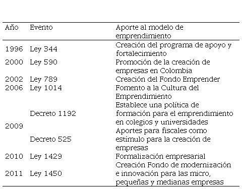 El gobierno colombiano ha desarrollado leyes y reglamentaciones para el fomento de la cultura del emprendimiento, el desarrollo del espíritu emprendedor y el fortalecimiento empresarial, siendo las más representativas las que se muestran a continuación en la tabla 2: