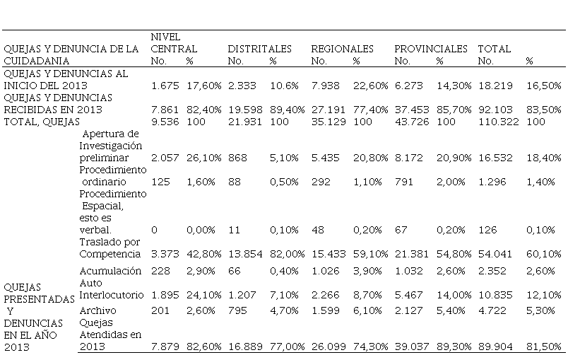 El año 2013, se da una apertura en cuanto a las quejas presentadas de 18.21, posteriormente se da un aumento de 92.103, que finaliza en el año con un global de 110.332 quejas presentadas y denuncias por diligenciar. De estas quejas y denuncias presentas se dio atención a personal de 89.904, esto presenta el 81,5% del global, sin embargo, se encuentran por resolver o tramitar 20.418.