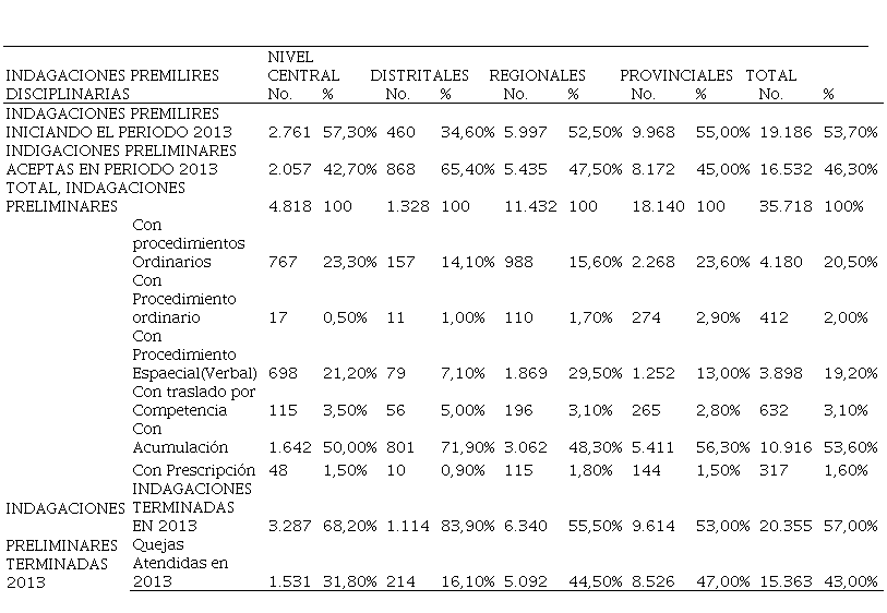 En el laxo perteneciente al año 2013 se presentan un numero de 116.906 en quejas y denuncias con relación a las faltas disciplinarias cometidas por los servidores públicos, así como también de los particulares que en alguna forma cumple funciones públicas de los cuales fueron resultas un total de 96.721, que apuntan a un 82,7% (Procuraduría General de la Nación, 2014).