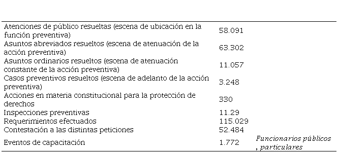 El informe de este periodo respecto de la función preventiva dice que se resolvieron 314.831 procesos, de estos se efectuaron 115.029 (36%) requerimientos, el 20% asuntos abreviados resueltos que corresponde a 63.302 y 58.091 que sería un 18% de la atención a público solucionada (Procuraduría General de la Nación, 2018).
