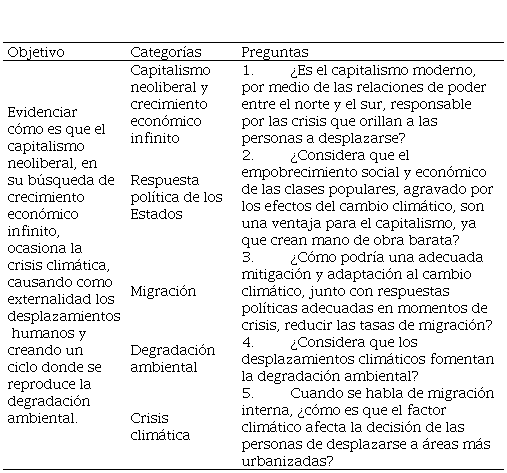 Para diseñar el instrumento, se formuló el objetivo general de la investigación, y con base en él, se desplegaron las categorías que lo integran. Se utiliza la migración como categoría, a pesar de que se mencionó anteriormente que el término más adecuado para el fenómeno climático es desplazamiento, debido a que este concepto puede usarse de forma más general al momento de hacer las preguntas a los expertos. Dichas preguntas se formularon con la intención de encontrar las relaciones entre las categorías establecidas, como se puede observar en la Tabla 1.