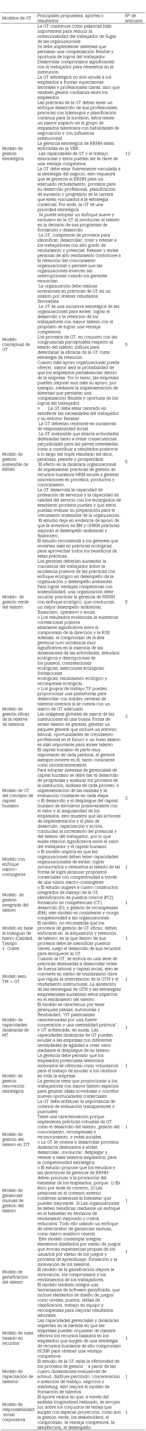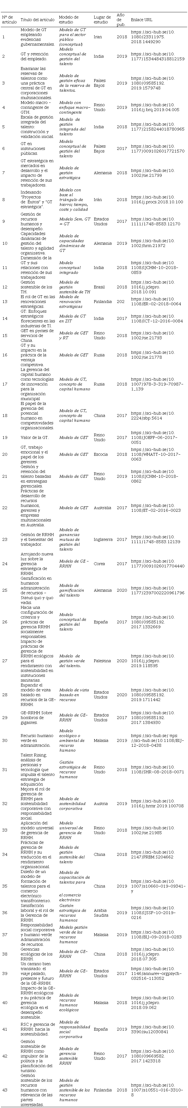 A manera de síntesis, se indica que los modelos de GT según los artículos más revisados son: 1) Modelo de gestión estratégica; 2) Modelo conceptual de gestión del talento; 3) Modelo de gerencia sostenible de RRHH; y 4) Modelo de gerencia verde del talento. Así mismo, los modelos con menos cantidad de estudios revisados son los siguientes: 1) Modelo de gestión eficaz de la reserva de talentos; y 2) Modelo de gestión del talento del concepto de capital humano.