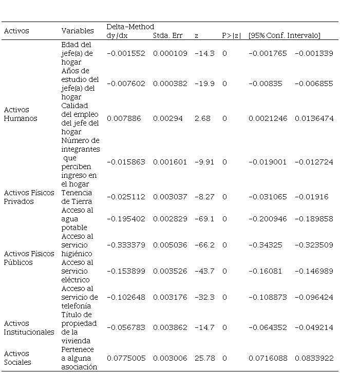 Por esa razón, en este trabajo de investigación se realizó el análisis correspondiente de los datos tomando en cuenta el efecto marginal de las variables y su valor de significancia, teniendo así los siguientes resultados : acceso a servicios básicos como agua potable (19.54%), electricidad (15.38%), saneamiento (33.33%), telefonía (10.26%), título de propiedad de la vivienda (5.6%), edad (0.15%), número de integrantes que perciben ingreso en el hogar (1.50%), años de estudio del jefe de hogar (0.76%), tenencia de tierras (2.50%) reducen respectivamente en tanto por ciento la posibilidad de que el individuo se encuentre en la pobreza, denotándose una correlación inversa entre las variables dependientes e independientes. Por otro lado, respecto a la calidad del trabajo del jefe del hogar, las personas que tienen una mala calidad de empleo tienen 0.79% de probabilidad de ser pobre, además referente a la pertenencia a alguna asociación, las familias que cuenten con activos sociales tienden a tener 7.75% de probabilidad de ser pobre. En este sentido, de acuerdo con el valor de p todas las variables son significativas, y con base en los efectos marginales, algunas variables influyen en una mayor probabilidad al nivel de pobreza que otras, siendo así que a criterio de los autores se dio mayor relevancia a aquellos activos que superan el 5%, considerándose para lo siguiente como variables más significativas, y a aquellos activos menores a 5% se le denominó en adelante variables menos significativas o menos relevantes.(Cuadro 01)